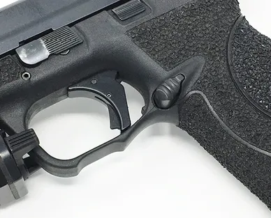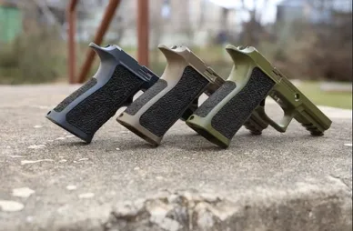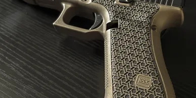 Removing the finger groove on a pistol is a great way to make your gun feel better to hold. We remove the factory groove and replace it with laser etched grip stippling. Additionally, we can leave in tact the actual grooves and sand them out. Then we apply new laser stippling.